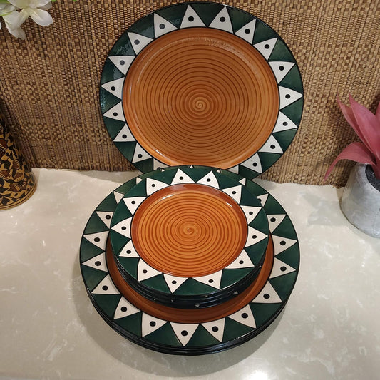 Caffeine Ceramic Handmade Red & Green Tribal Dinner Set (Set of 6)