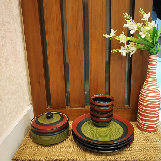 Caffeine Ceramic Handmade Red & Black Combo Dinner Set ( 15 pcs. Microwave & Dishwasher Safe )