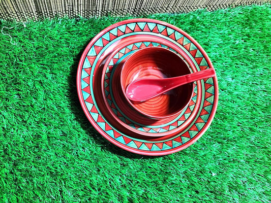 Caffeine Ceramic Handmade Red Bamboo Combo Dinner Set (12 pcs.)