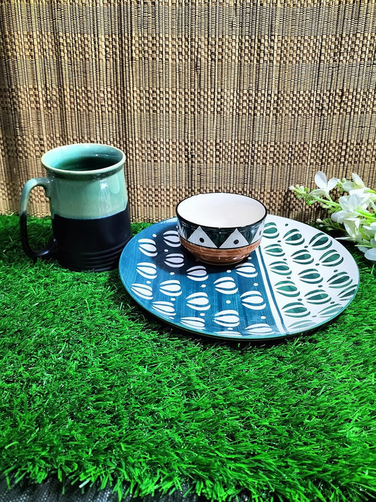 Caffeine Ceramic Handmade Green Chandrakari Combo Dinner Set (9 pcs.)