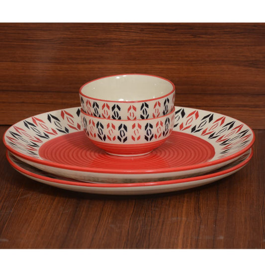 Caffeine Ceramic Handmade Red & Black Dotted Combo Dinner Set ( 2 Dinner Plate , 2 Katori Bowl )