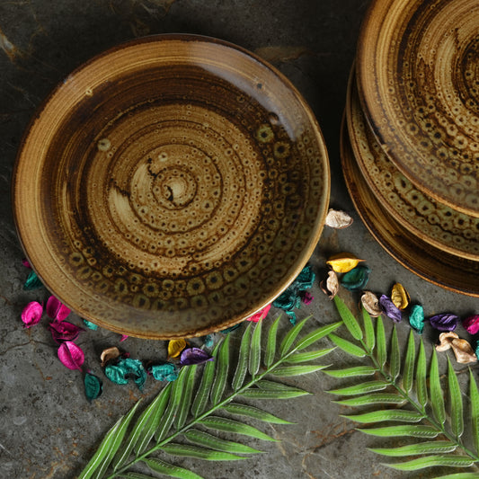 Caffeine Ceramic Handmade Stoneware Brown Wooden Dinner Plate 10 '' Set of 6 (Microwave & Dishwasher Safe)
