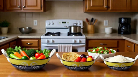 Caffeine Ceramic Handmade Stoneware Mustard Romani Serving kadhai (Set of 3 Dishwasher & Microwave Safe)