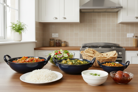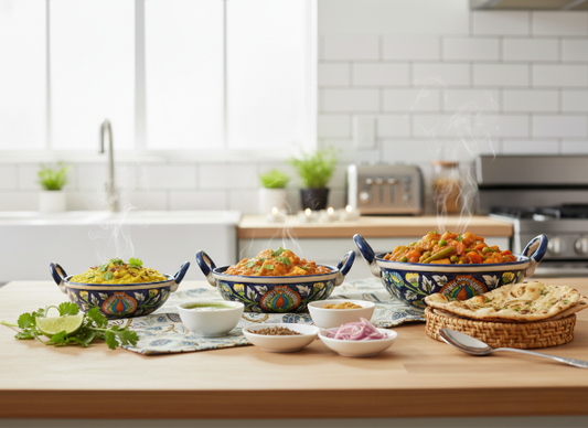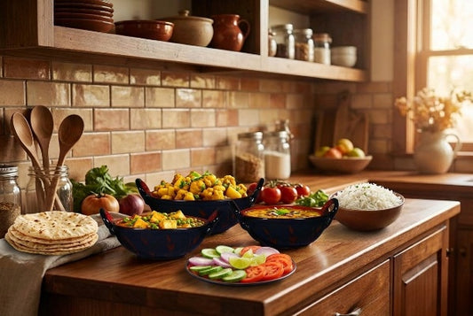 Caffeine Ceramic Handmade Stoneware Blue Jaipuri Serving kadhai (Set of 3 Microwave & Dishwasher Safe)