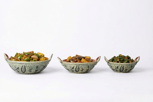 Caffeine Ceramic Handmade Stoneware Green & White Bamboo Serving Kadhai (Set of 3 Microwave & Dishwasher Safe)