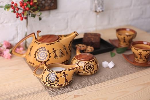 Caffeine Ceramic Handmade Mustard Romani Printed Tea Sets (Set of 15 pcs)