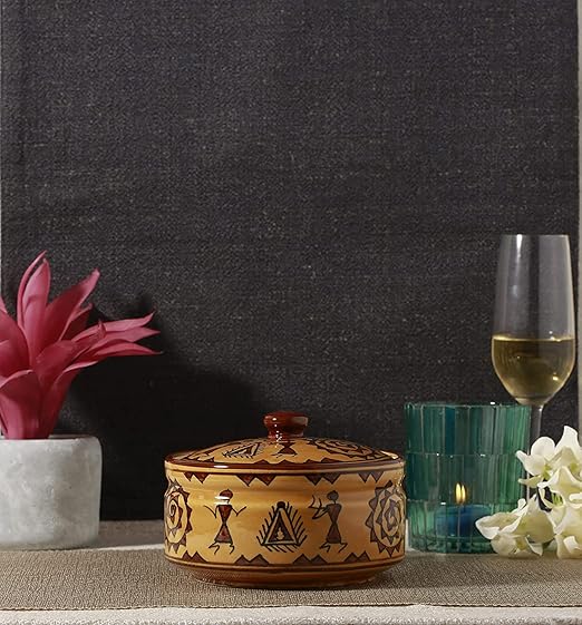 Caffeine Ceramic Handmade Mustard Romani Serving Handi with Lid (Set of 1) large
