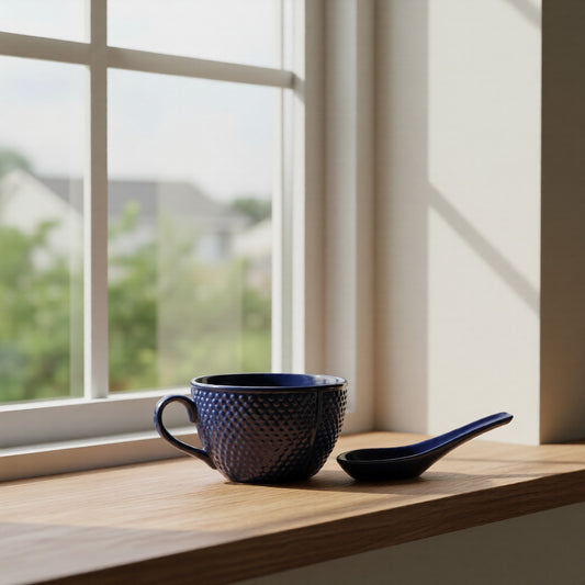 Caffeine Ceramic Handmade Blue Bubble Single Handled Soup Bowl with Spoon (Set of 2)