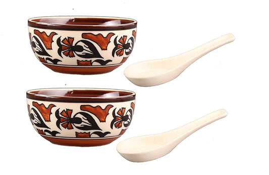Caffeine Ceramic Handmade Brown and White Flower Print Soup Bowl with spoon set of 6