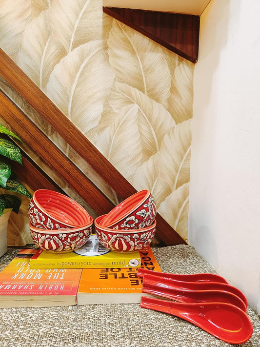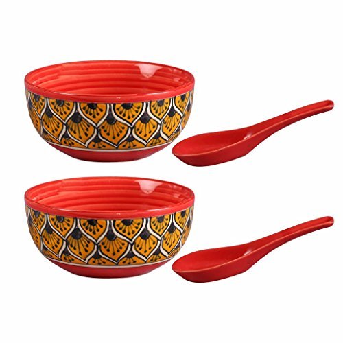 Caffeine Ceramic Handmade Red Mughal Soup Bowl with spoon set of 6