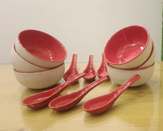 Caffeine Ceramic Stoneware Handmade red & White Soup Bowl with spoon set of 6