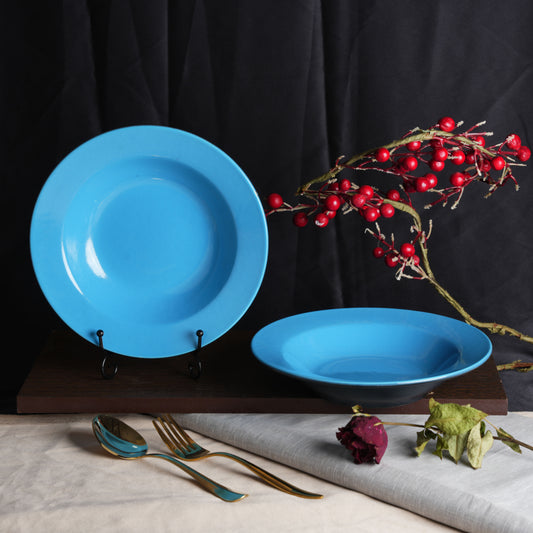 Caffeine Ceramic Handmade Stoneware Blue 9 inches Soup Plate/Pasta Plate/Maggie Plate/Macaroni Plate (Set of 4 Dishwasher & Microwave Safe)