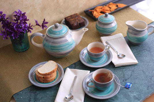 Caffeine Ceramic Handmade Stoneware Sea Green Printed Tea Set of 15
