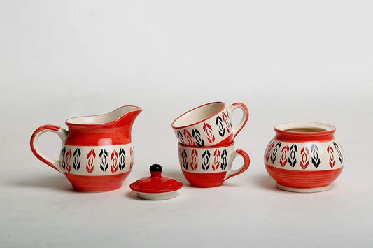 Caffeine Ceramic Handmade Tea Set with Kettle red Mughal Printed Tea Set of 15