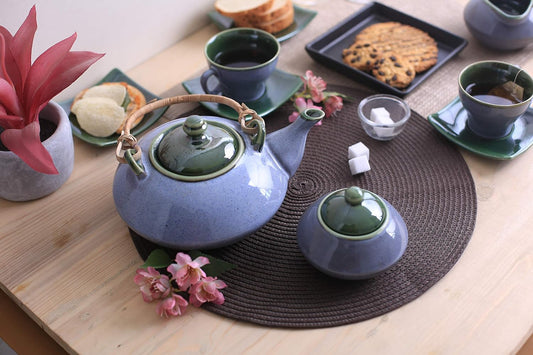 Caffeine Ceramic Handmade Stoneware Blue and Green Ferrous Studio Tea Set of 15