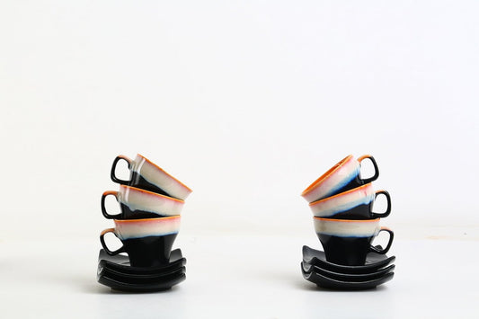 Caffeine Ceramic Handmade Tea Set Green and Orange Printed Tea Set of 15