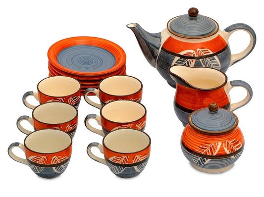 Caffeine Ceramic Handmade Stoneware Orange Zig zag Tea Set (Set of 15 pcs)