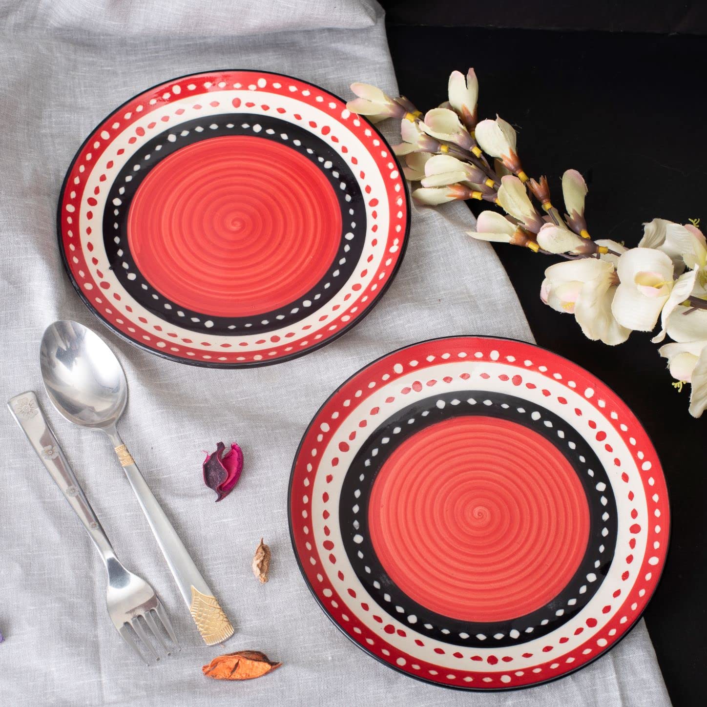 Caffeine Premium Ceramc Handmade Red & Black Dot Combo Dinner Set of 14 Pcs (4 Dinner Plate, 4 Quarter Plate, 4 Katori Bowl, 2 Serving Bowl)