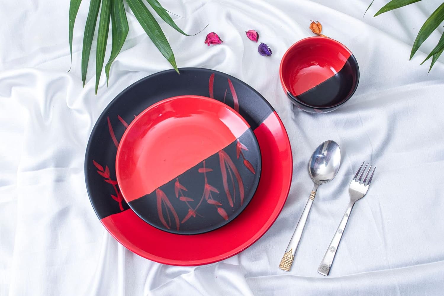 Caffeine Premium Ceramic Handmade Black & Red Combo Dinner Set (3 pcs. 1 Dinner Plate, 1 Quarter Plate, 1 Katori Bowl). Unconventional dinnerware range. This is one of the most gracious products from Caffeine. All colors used on our dinnerware are food-safe.