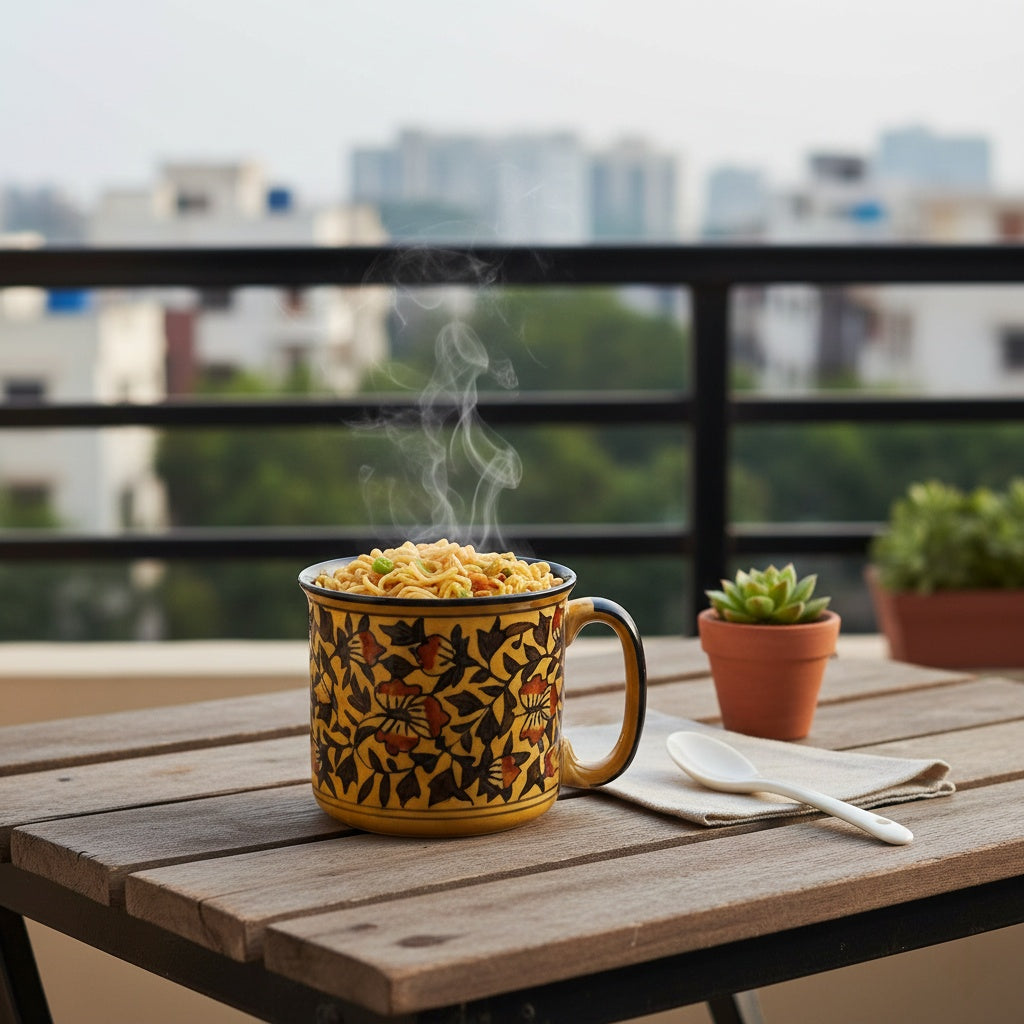 Caffeine Ceramic Handmade Maggie Mug. Notes: Set of 6. These mugs will not leave you unturned, either cozy winter hot chocolate or soupy noodles, these will solve your purpose. 150-year-old Mughal Pattern hand painted on the mugs. All colors and glazes used on our Dinnerware are food-safe, and protected by eco-glaze. Slight and minor color changes could be noticed as each product is individually made by hand. Flash used in the shoot and differences in screen resolutions could also be a reason.