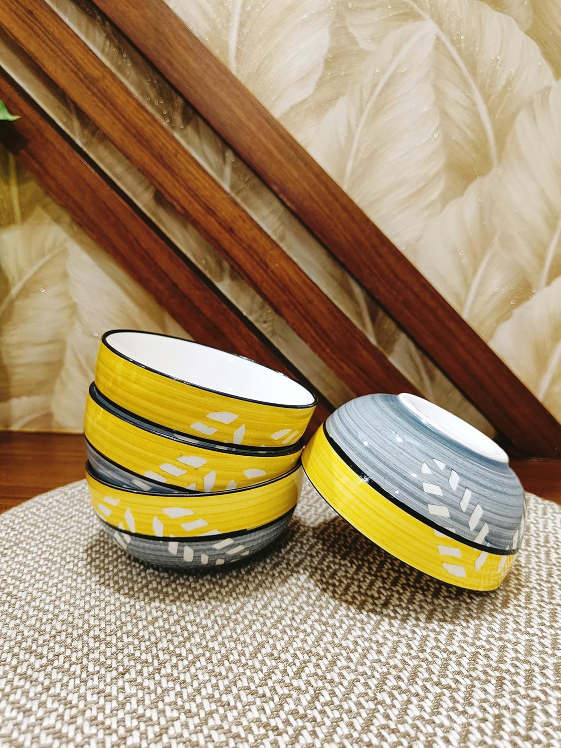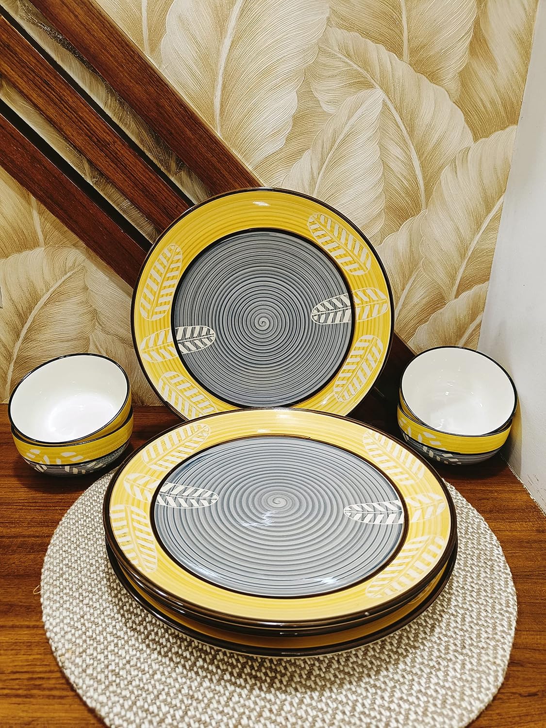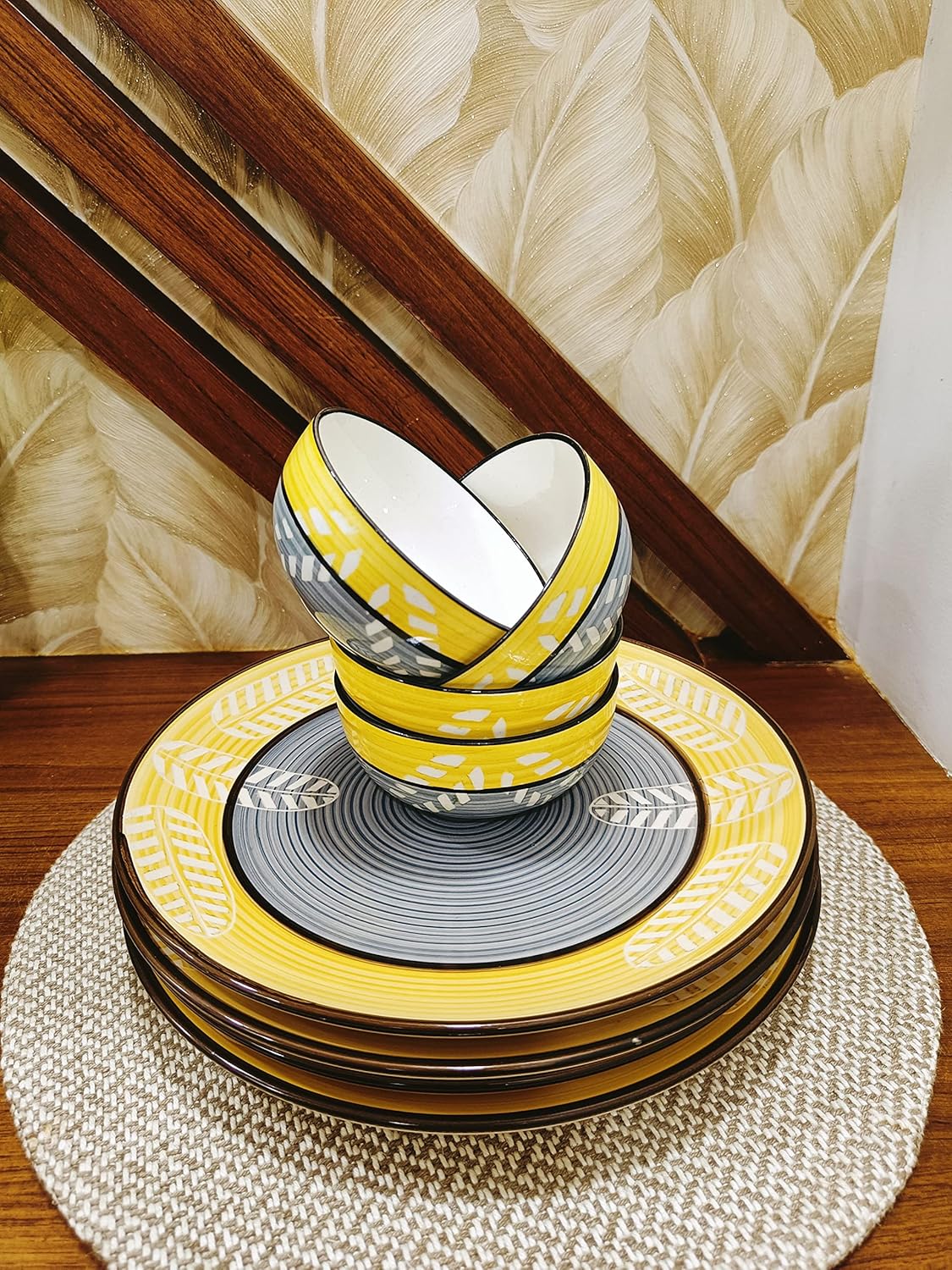Yellow Leaf Dinner set gives the required boldness yet soothing to the eyes because of the glossy ceramic finish. The handcrafted pattern adds a classic effect to this dining beauty. Those who love their food and kitchen can just not get over this. 100 % Handmade with Royal Finish. This is one of the most gracious products from Caffeine. All colors used on our dinnerware are food-safe.
