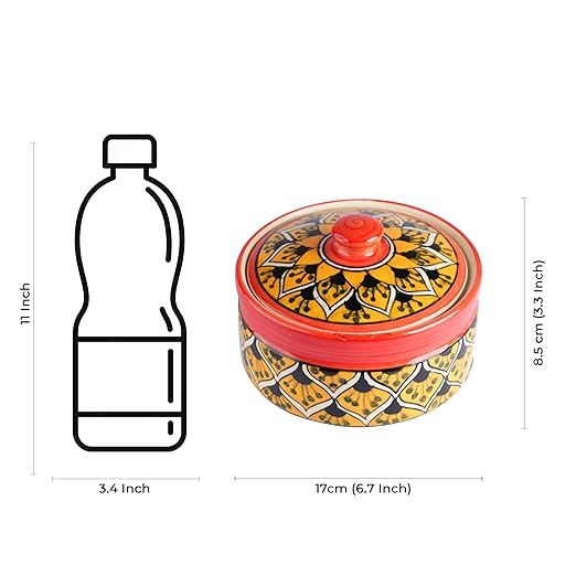 Caffeine ceramic handmade casserole orange Morocco donga with Lid Orange set of 1 with lid. These are suitable for serving veggies, rice dishes, and many more. All colors used on our dinnerware are food-safe. Craft: Stoneware. Not suitable for direct burner. Only use indirect sources of heat. Please do not put it in a preheated oven/microwave. Do not freeze at high freezing temperatures.