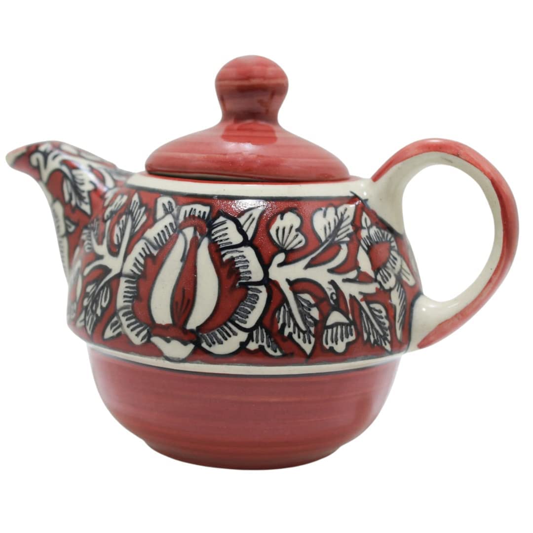 Caffeine Ceramic Handmade Red Mughal 2 in 1 Teapot with Cup (Set of 1). This is an elegant piece of ceramic works with perfect detailing and glaze. This is suitable for tea and coffee time. The beauty gets refined with matte texture of the product and perfect appealing color glaze and leaf pattern.