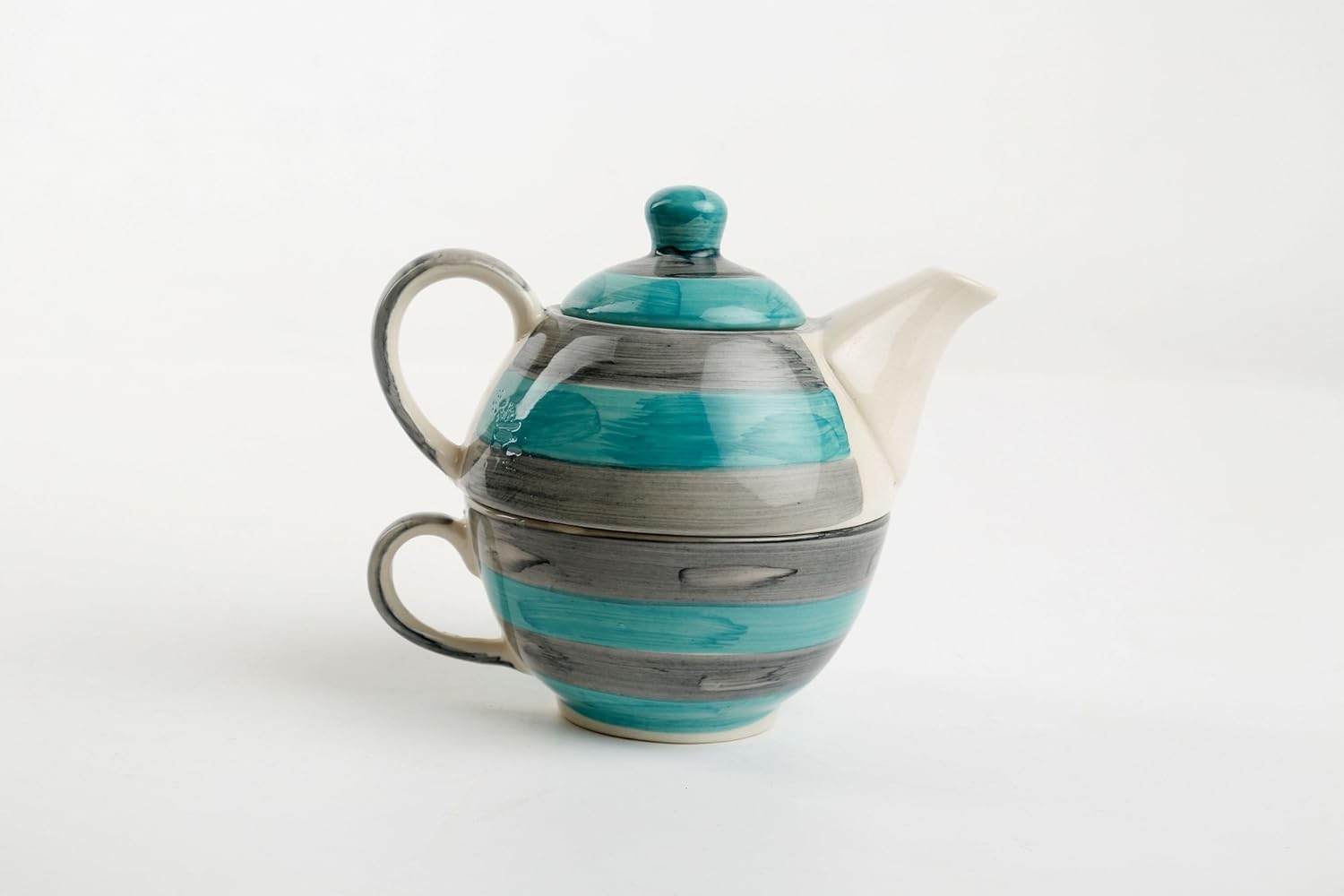 Caffeine Ceramic Handmade Sea Green 2 in 1 Tea Pot (Set of 2, Kettle with Cup)