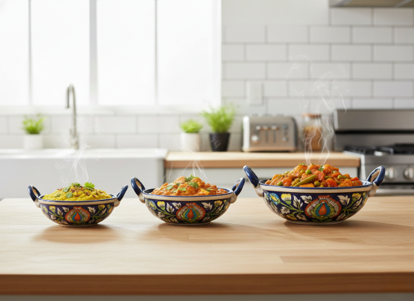 Caffeine Ceramic Handmade Serving Kadhai Set with handles on either side. Notes: Set of 3- Large, Medium & Small Serving Kadhai. These Servings are superiorly preferable for Indian big fat dinner times either vegetables or sizzler dishes, this'll serve your purpose. Inspired by Indian pottery, design intrinsically hand painted on the plates by artisans. All colors and glaze used on our Dinnerware are food safe as it's protected by Eco - glaze. CRAFT: Vitrified Stoneware that does not absorb moisture, is more hygienic and has better heat retention properties.