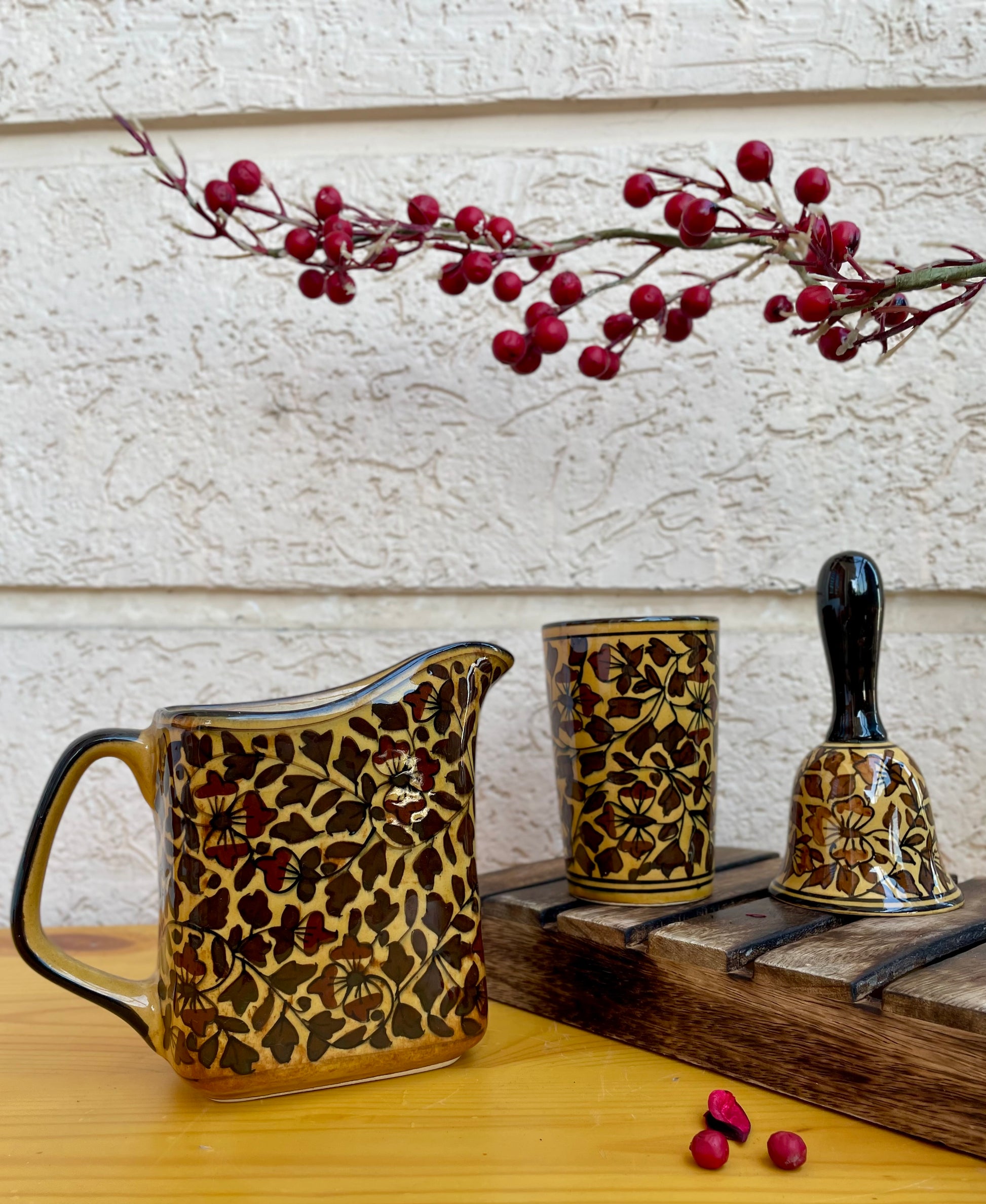Caffeine Ceramic Handmade Water Jug. Notes: 1 Pc. All colors and glazes used on our Dinnerware are food safe as it's protected by eco-glaze. CRAFT: Vitrified Stoneware that does not absorb moisture, is more hygienic, and has better heat retention properties. Each design is handcrafted under glaze prolonging the life of the product, improving stain and metal mark resistance and chip resistance durability. Completely lead-free, suitable for the direct burner